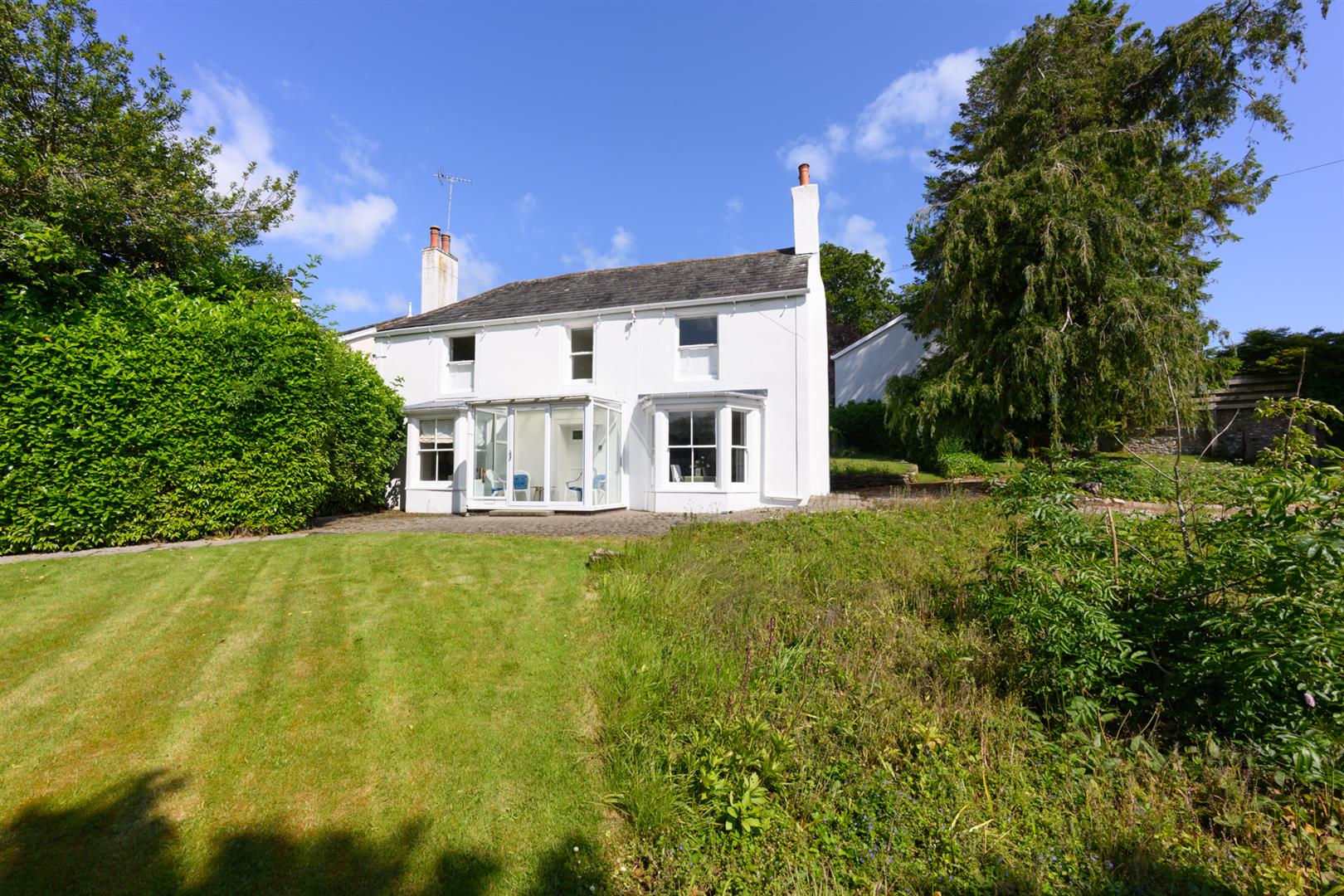 A shared drive gives access onto the private drive of Elmcote and this leads to a turning circle with a beautiful Cypress tree to the centre.