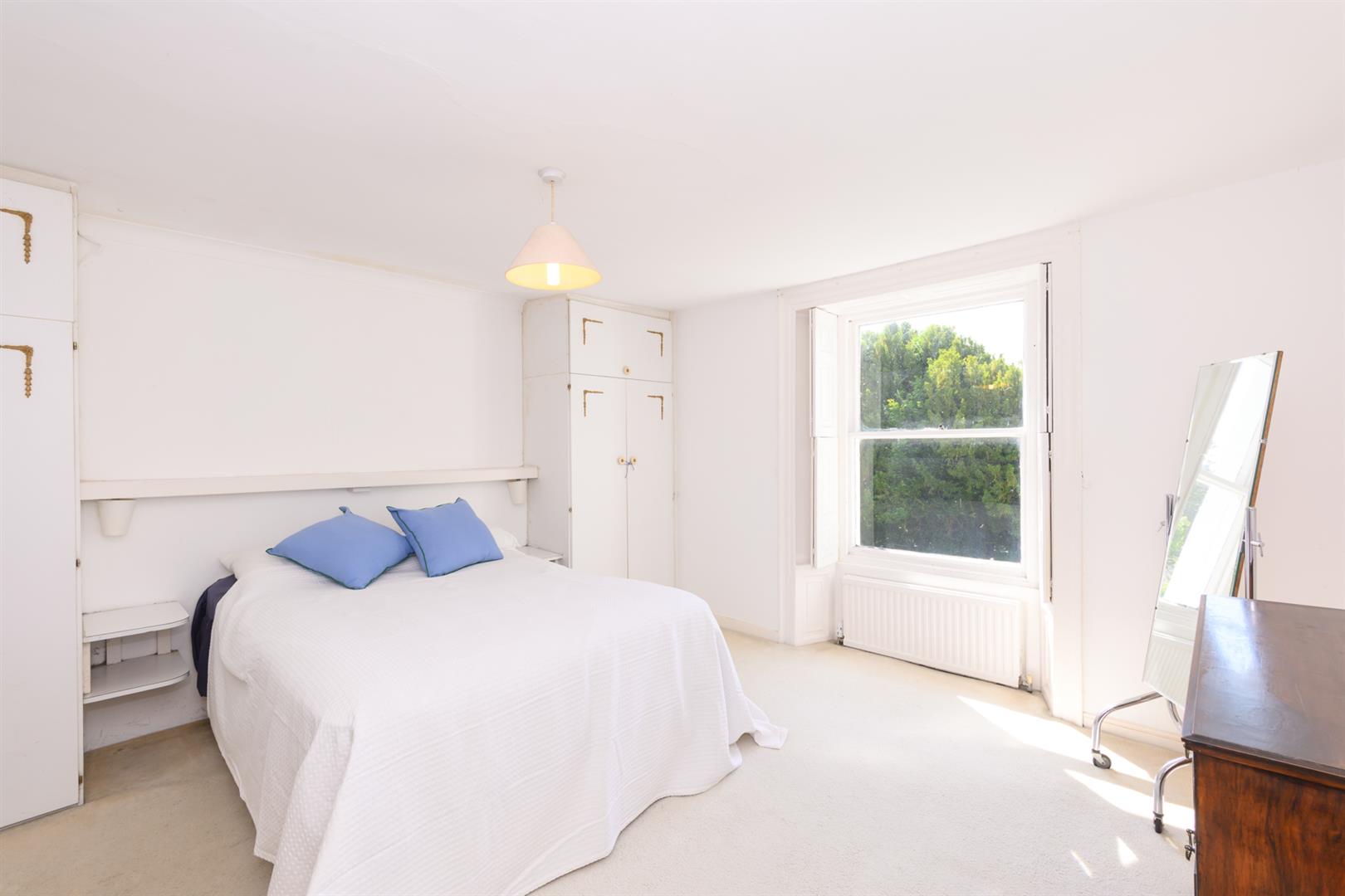A spacious double bedroom to the front with working shutters, built-in cupboards, servant’s bell, shelving and painted wood panelling.