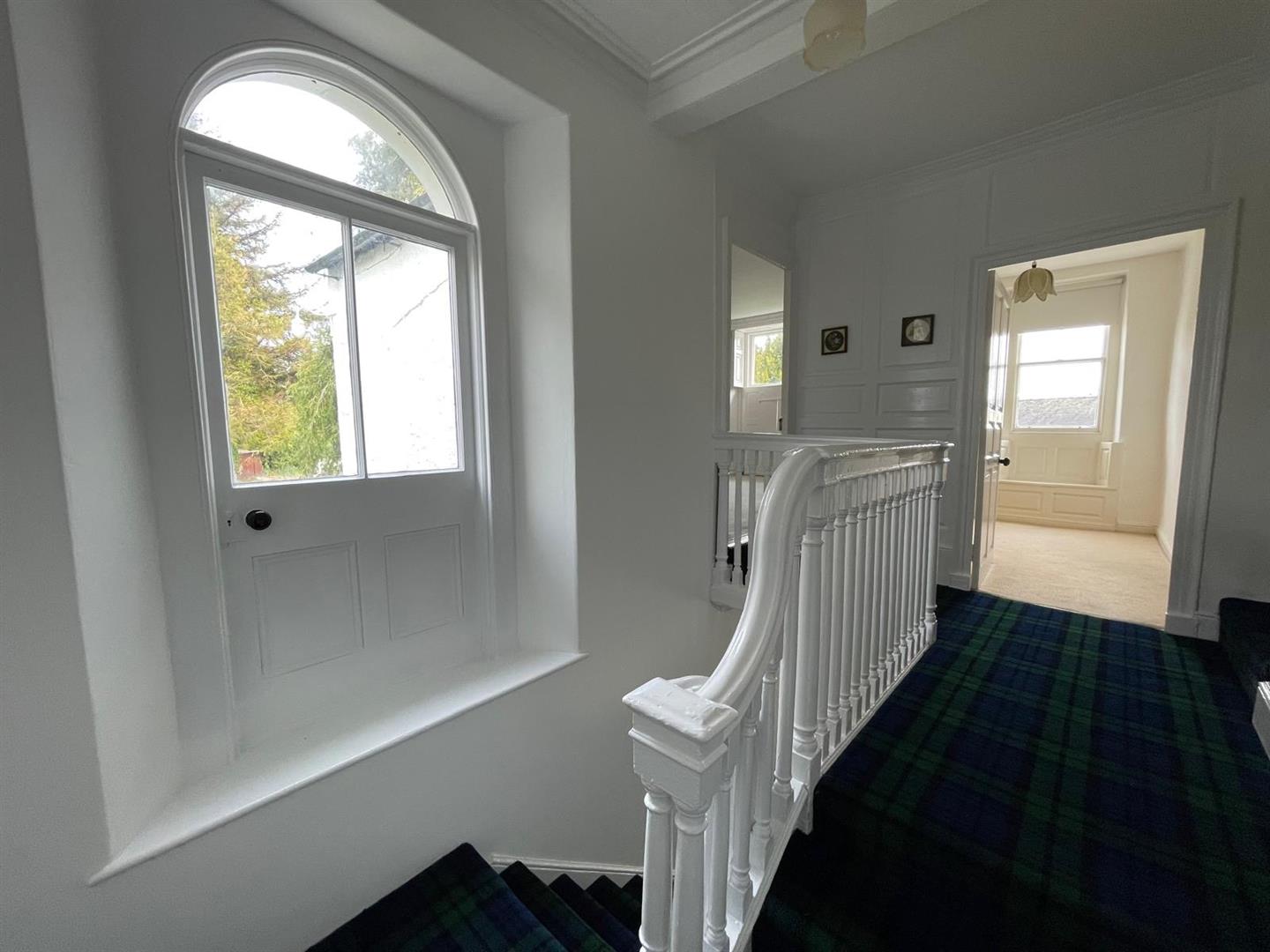 An attractive staircase (with burglar step!) leads to the first floor landing. Arched window to the side, with clear glazing panels. Painted wood panelling, coving and access to bedrooms and bathroom.