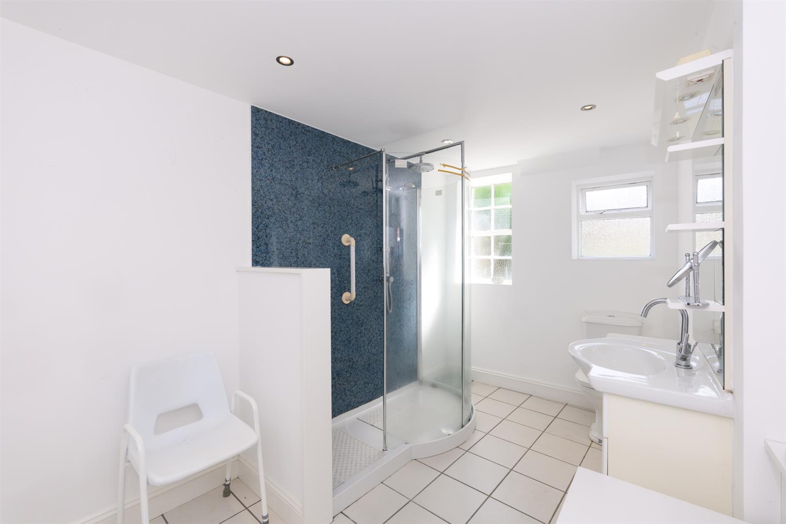Fitted with shower with curved screen in chrome frame, and wall mounted chrome shower and attachment including handheld hose and rainfall shower. Blue waterproof panelling. Wash basin with chrome mixer tap set into vanity unit with mirror above, shelving, shaver point and light. Low-level wc, white tiled floor, 2 frosted windows to the side, extractor fan, Victorian style heritage chrome and white heated towel rail/radiator, extractor fan and wall mounted Worcester gas boiler.