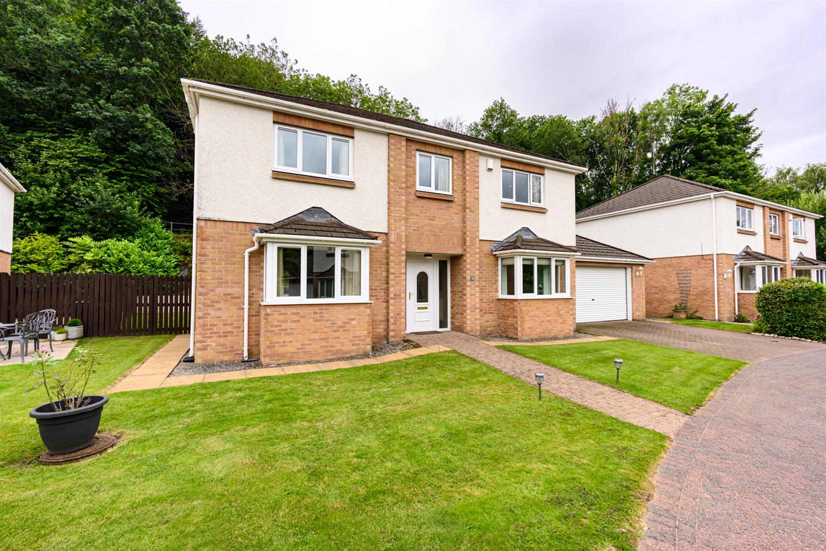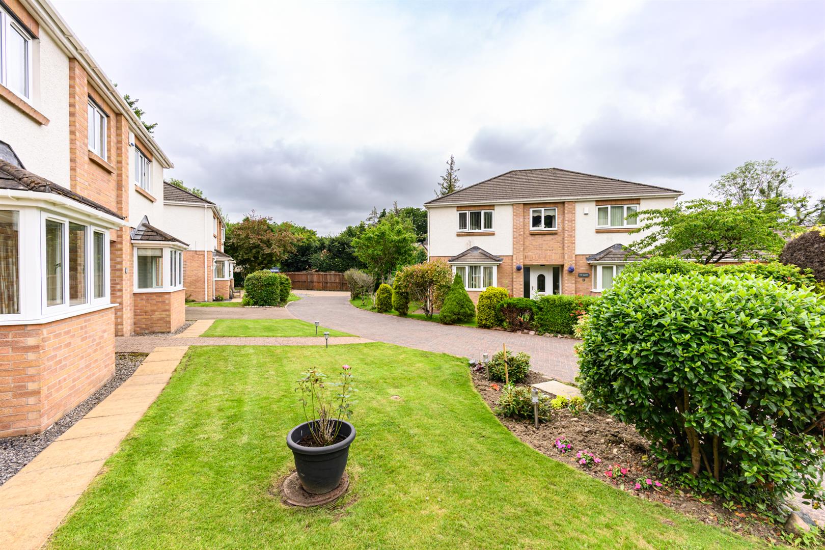 A brick paved drive Leads to the front door with small garden areas either side.