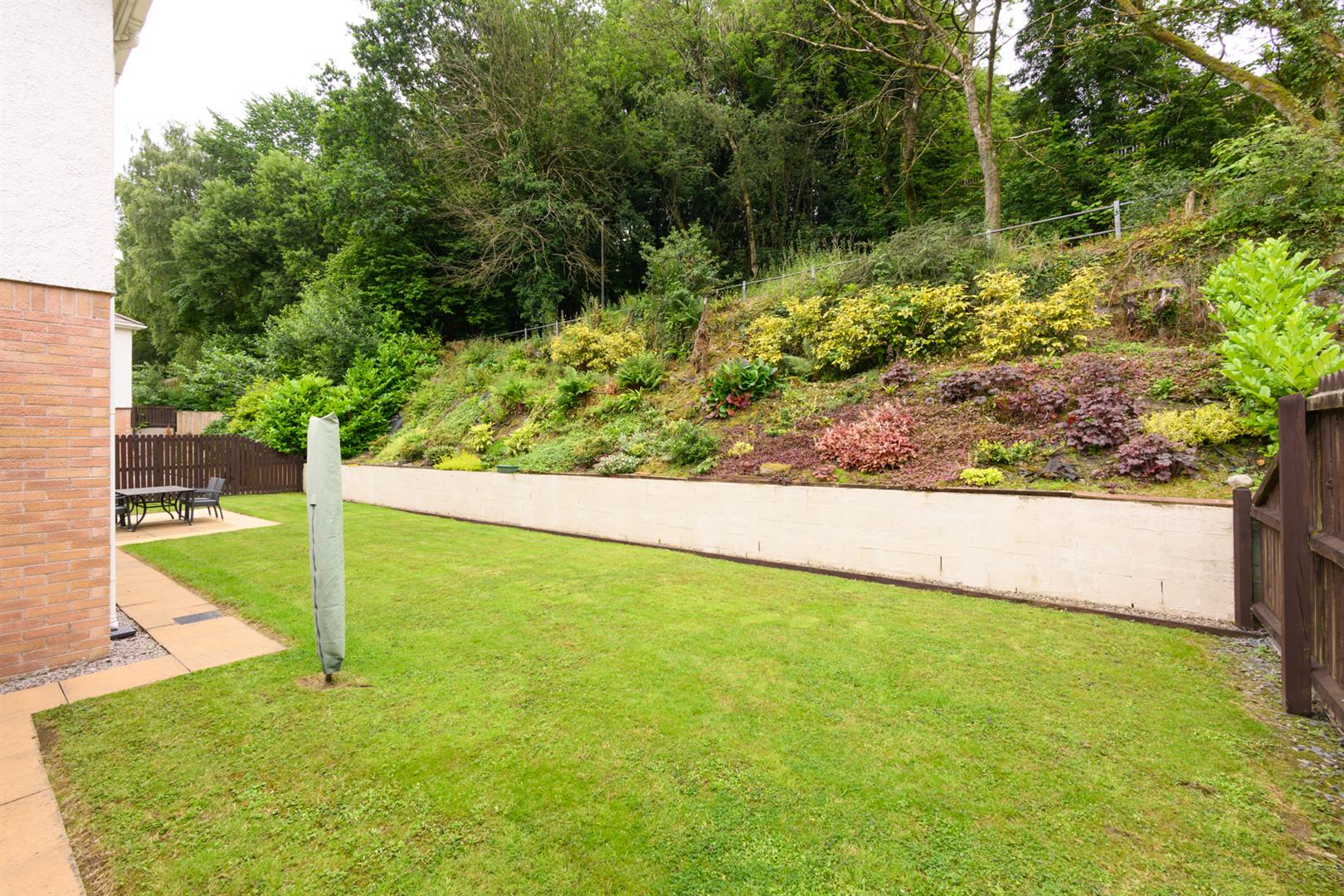With access from the lounge and a paved path that leads to the rear of the property, surrounded by lawn to the rear, and retaining wall gives leads up to a bank which is well planted with a fabulous selection of shrubs and flowers, trees.
