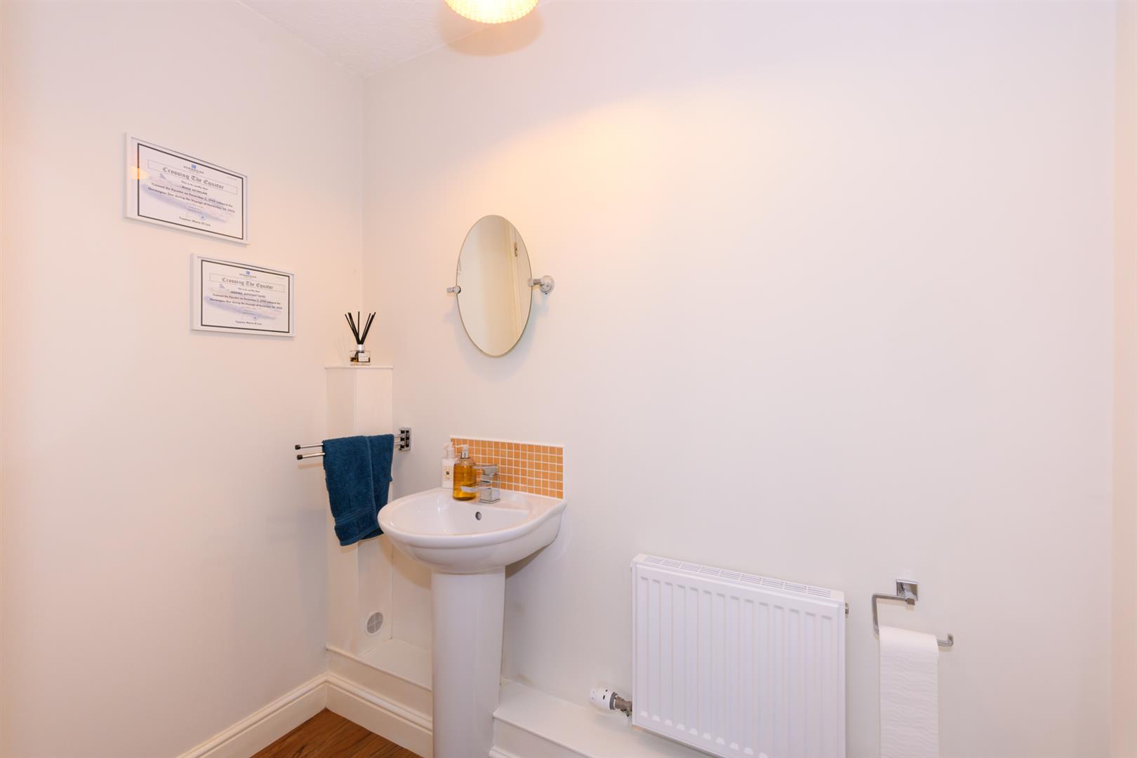 Fitted with low level WC, pedestal Wash Basin, tiled splashback and chrome tap with continuation of flooring and walk in cupboard with coat rack.