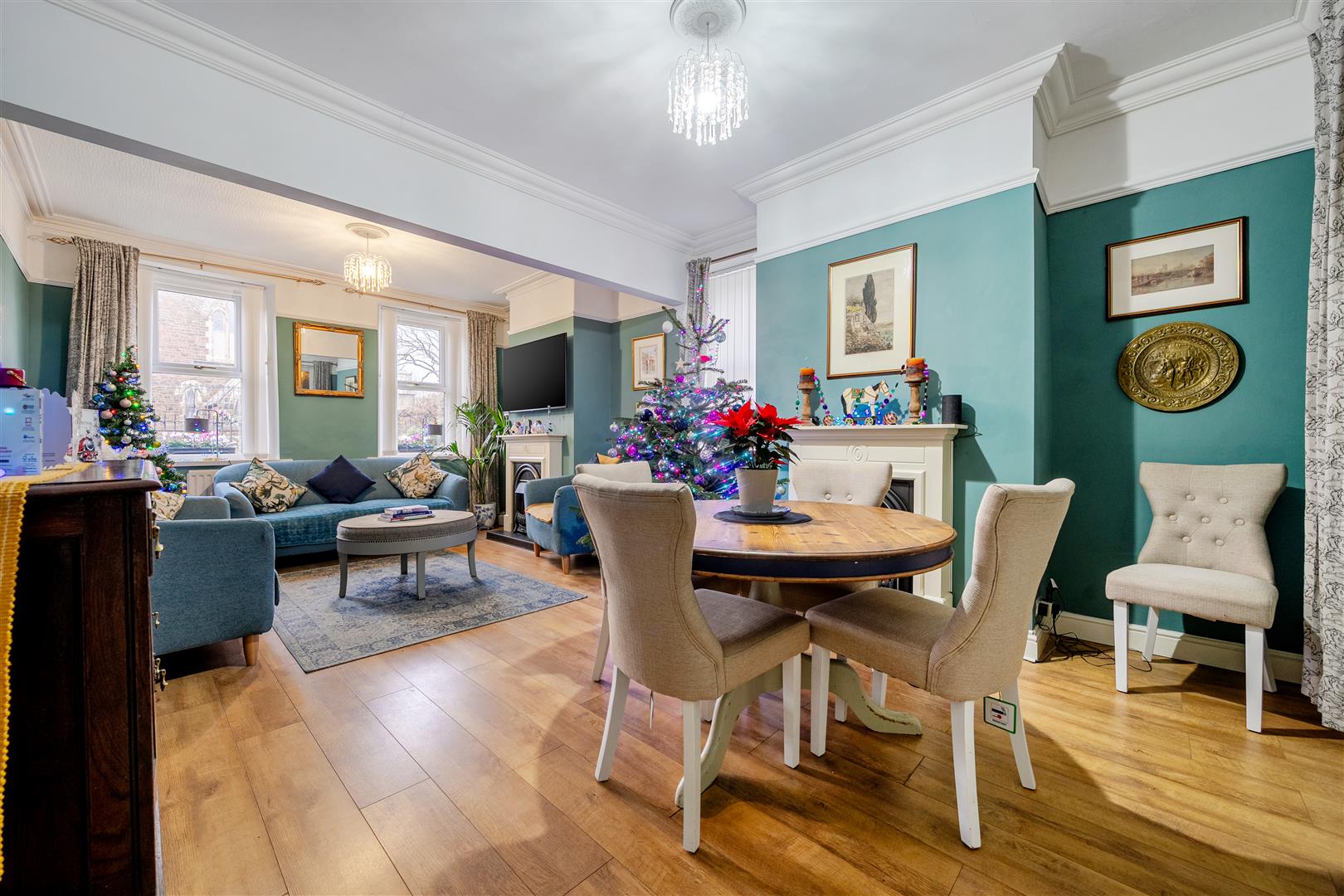 Dual aspect double glazed windows. Traditional coving and ceiling roses, laminate flooring, radiators, two electric fires set within decorative surrounds.