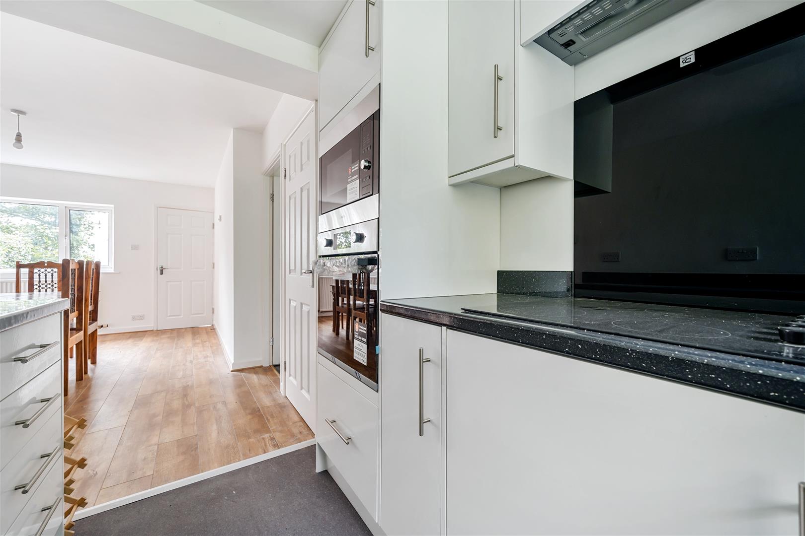 A contemporary kitchen with white gloss wall and base units complimented with black work surfaces. It comes fully equipped with Integrated dishwasher, integrated oven and hob with extractor fan above, integrated microwave, rear aspect double glazed window.