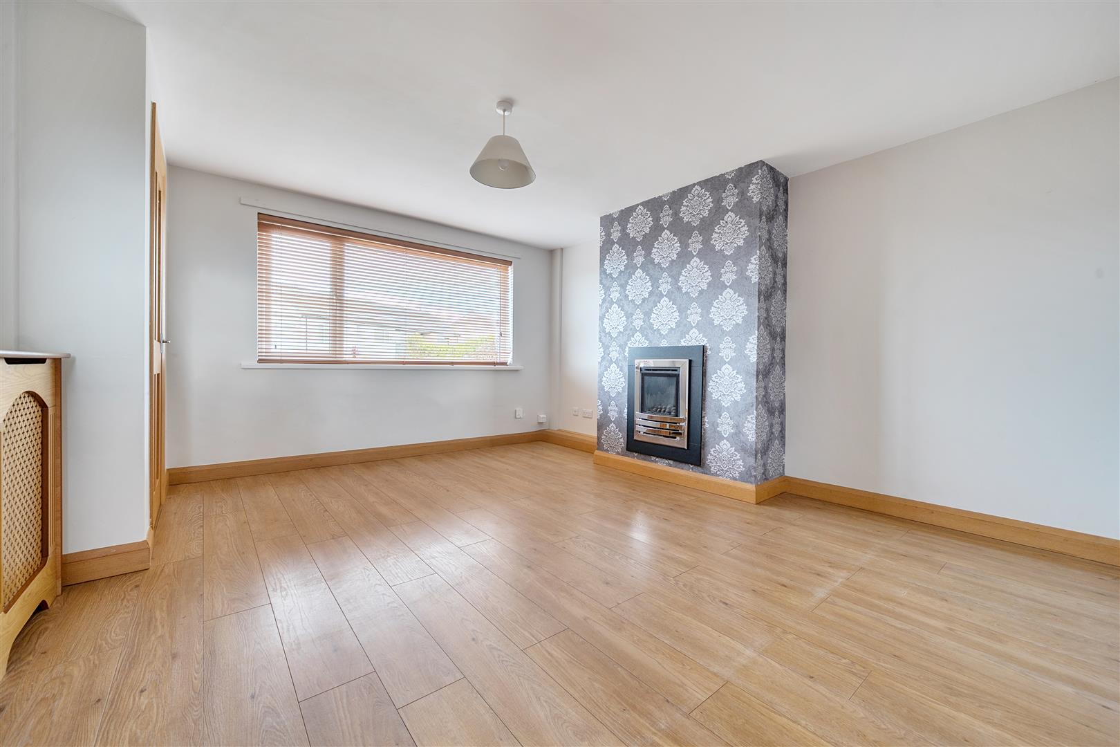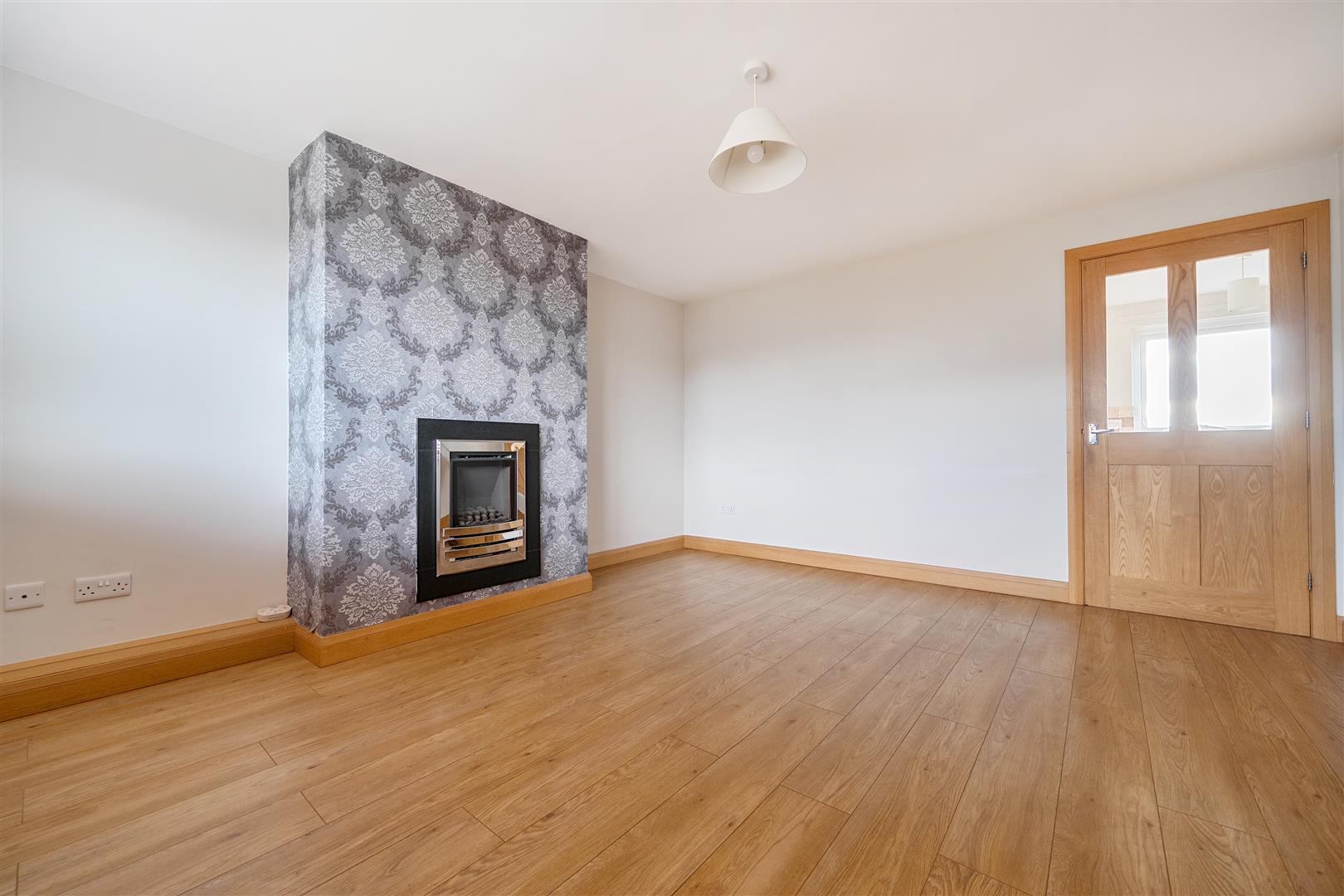 Window facing front elevation, laminate floor. Living Flame effect gas fire, television aerial point, telephone point, door through to kitchen