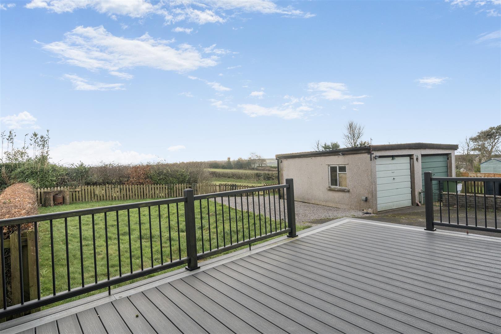 Decking area accessed from the rear of the house which drops down to a large lawn.