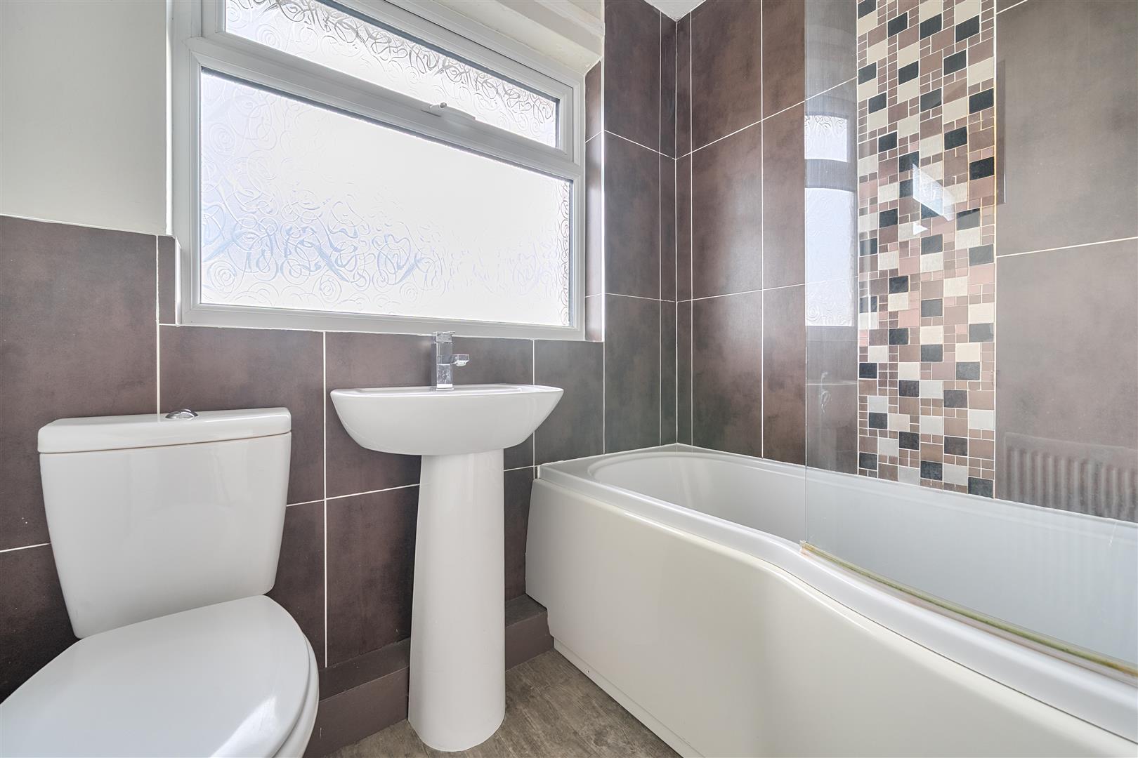 White bathroom suite comprising WC, wash hand basin, P shaped bath, mixer shower over bath, curved shower screen, tiled in bath/shower area, laminate flooring.