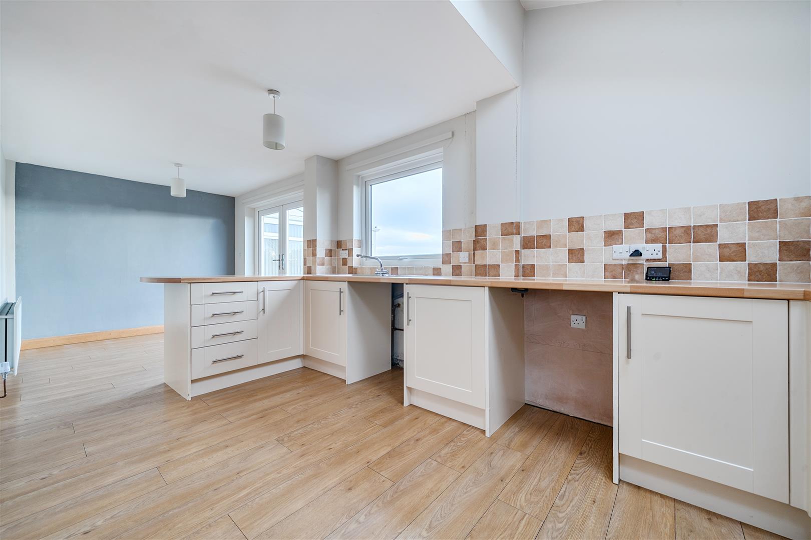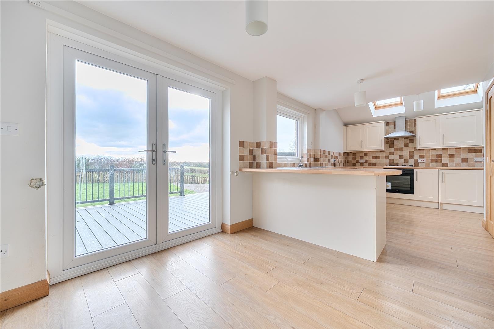 Fitted with a good range of cream wall & base units with silver handles and wood effect worktops. Built-in electric oven with gas hob and chrome extractor hood over. Integrated fridge, integrated freezer, space & plumbing for washing machine and dishwasher. Door onto front driveway, laminate floor, patio doors onto decking from dining area.