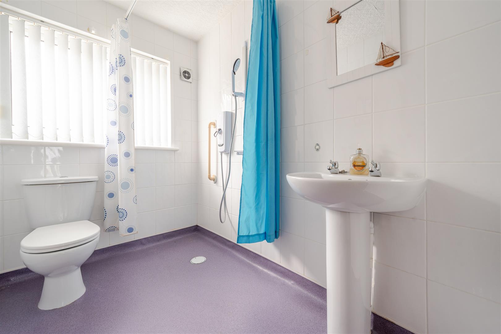 Wet room incorporaing a shower, WC, handbasin, tiled walls, extractor fan and rear aspect double glazed window