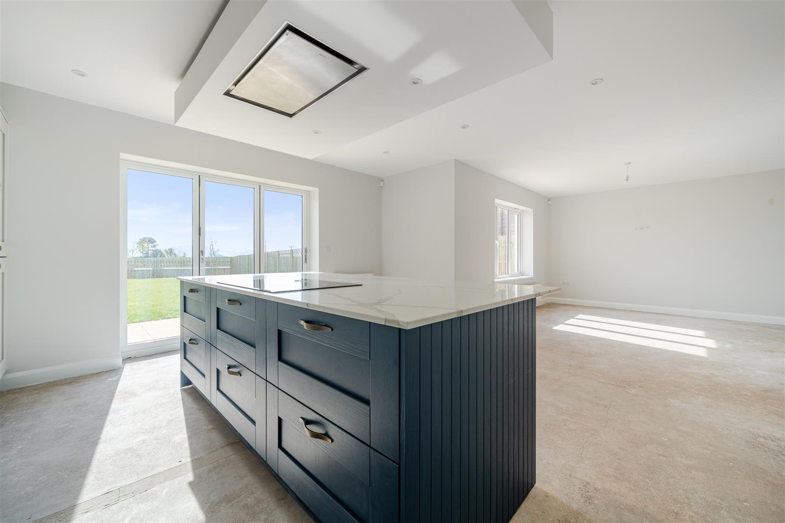 The heart of the home is a stunning open-plan kitchen, with dining, and family room. The luxurious kitchen, designed and supplied by Maryport Kitchens, features a contemporary central island—perfect for cooking, dining, and socialising. Premium integrated Bosch appliances include a ceramic electric hob, extractor, single oven, combi microwave, fridge freezer, and dishwasher.