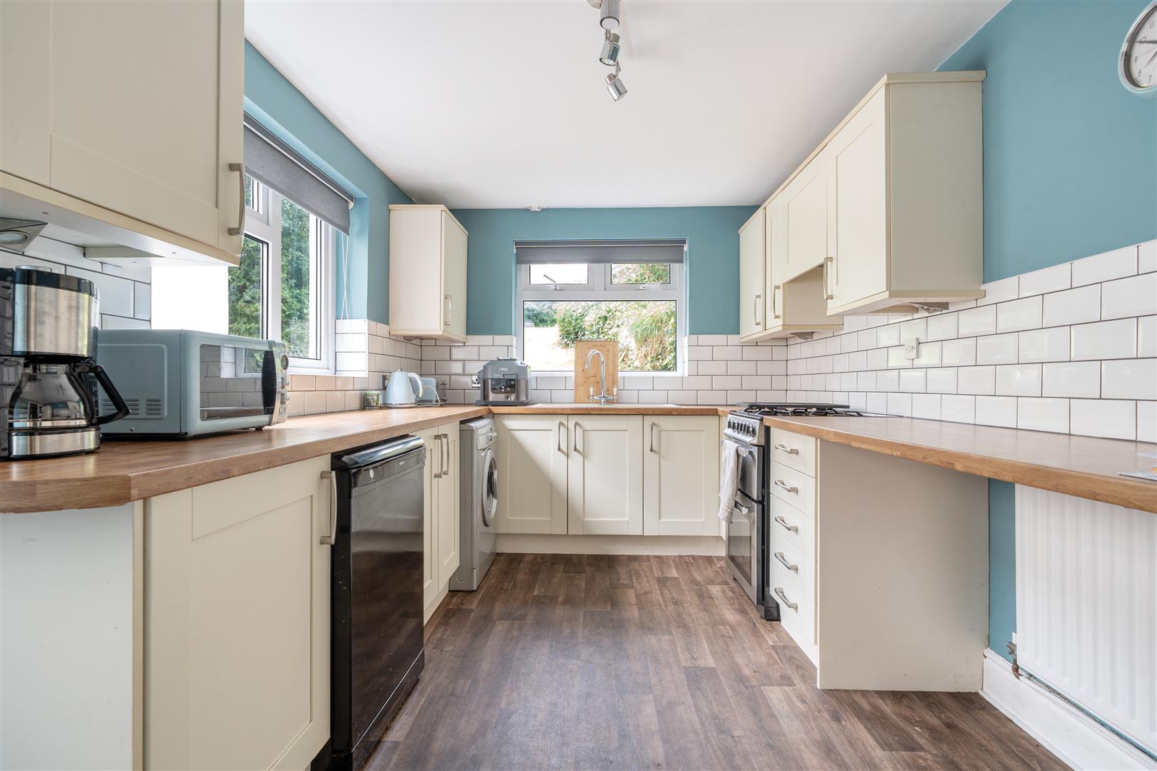 A range of wall and base units with complementary work surfaces and white tiled surrounds. Inset stainless steel sink unit, free standing cooker with four ring gas hob and stainless steel extractor over, plumbing for a washing machine, side and rear aspect, double glazed window, UPVC double glazed door to rear garden and radiator. Back from the entrance hall we have stairs to: