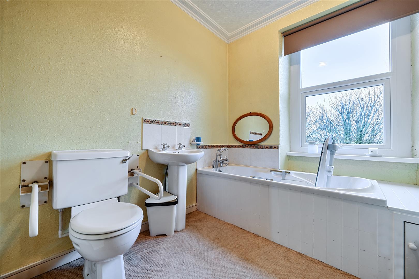 Three-piece suite comprising of bath, WC and wash basin. Side aspect double glazed window, radiator.