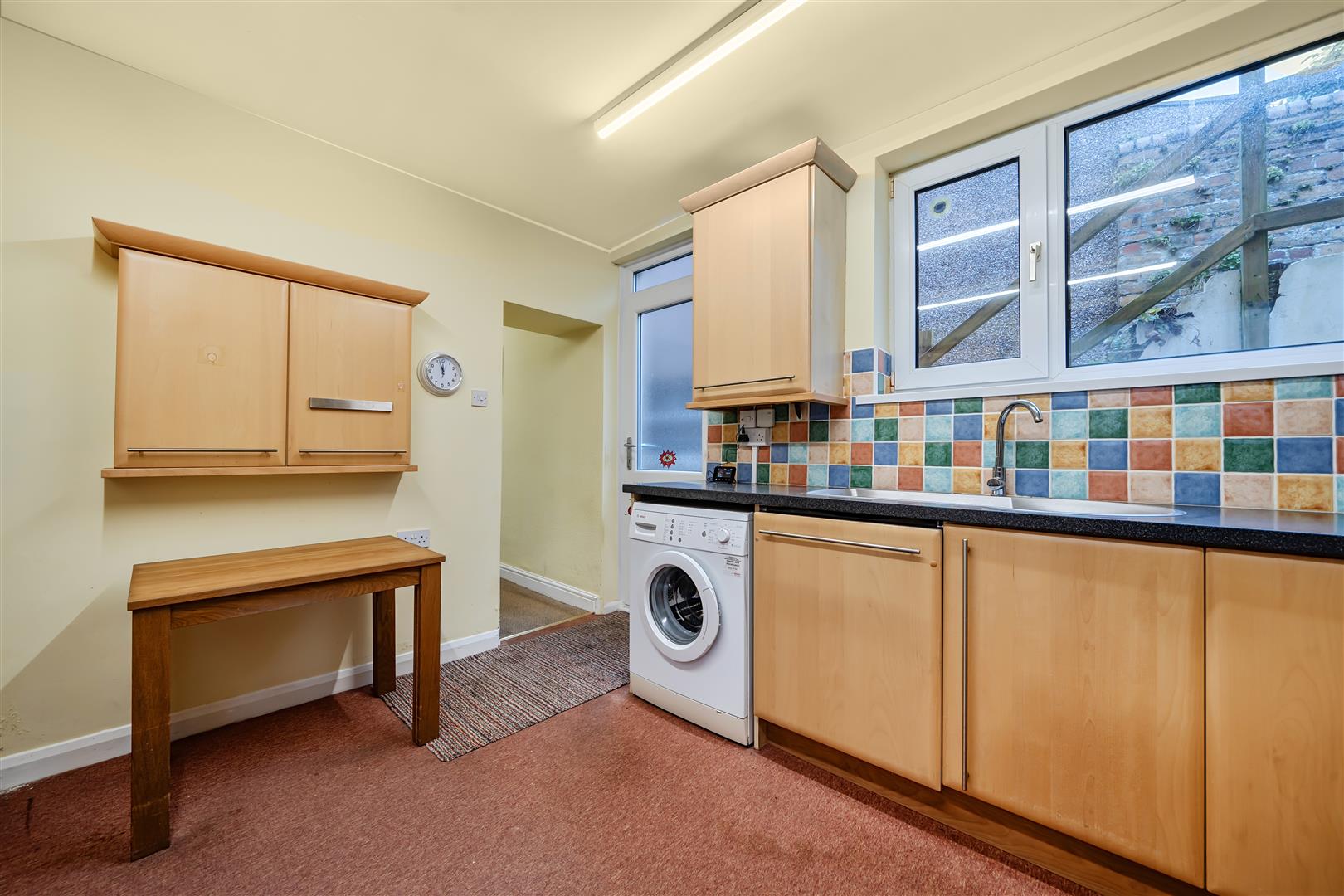Fitted with a range of wooden wall and base units with complimentary work surfaces, inset sink and drainer unit, plumbing for washing machine, dual aspect double glazed windows, multicoloured decorative wall tiling. UPVC part glazed door leading to the garden.