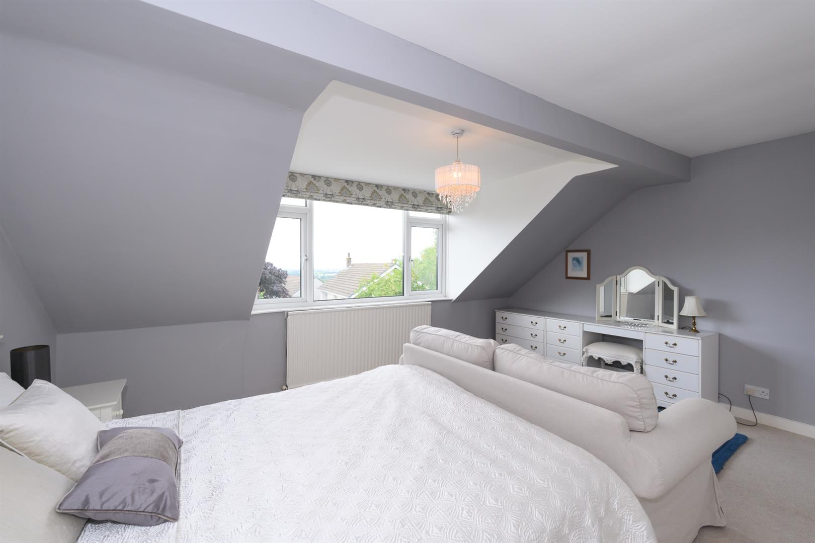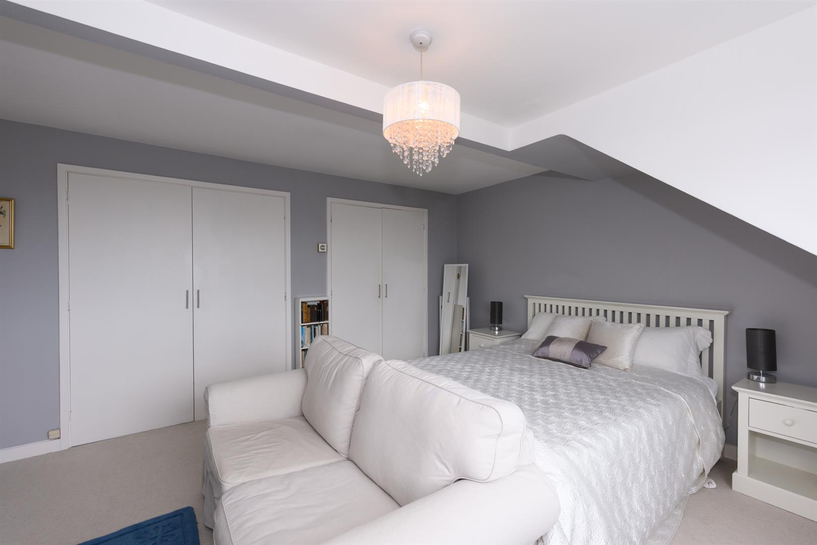 A fabulous double bedroom with an outlook over the rooftops to the countryside in the distance. Two sets of double built-in cupboards, one containing header tank and cylinder tank.