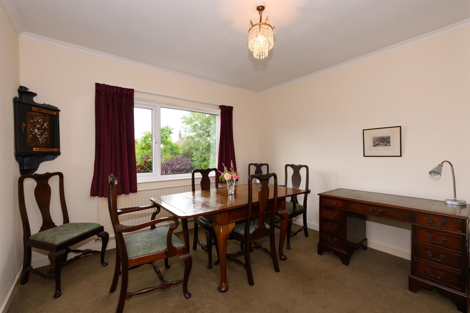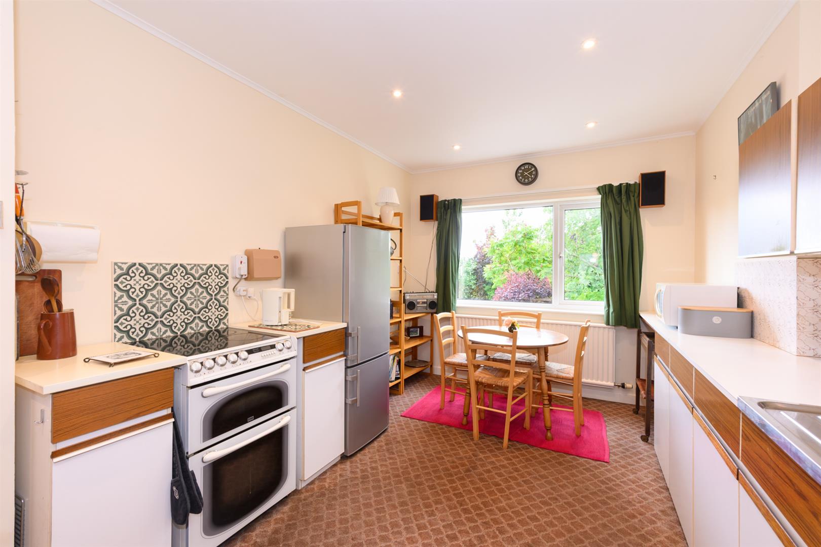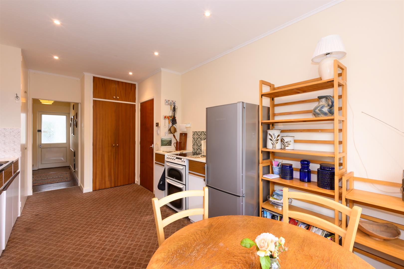 Coving, spotlighting, large window overlooking the garden and ample space for dining table. Two sets of double fronted built-in cupboards.