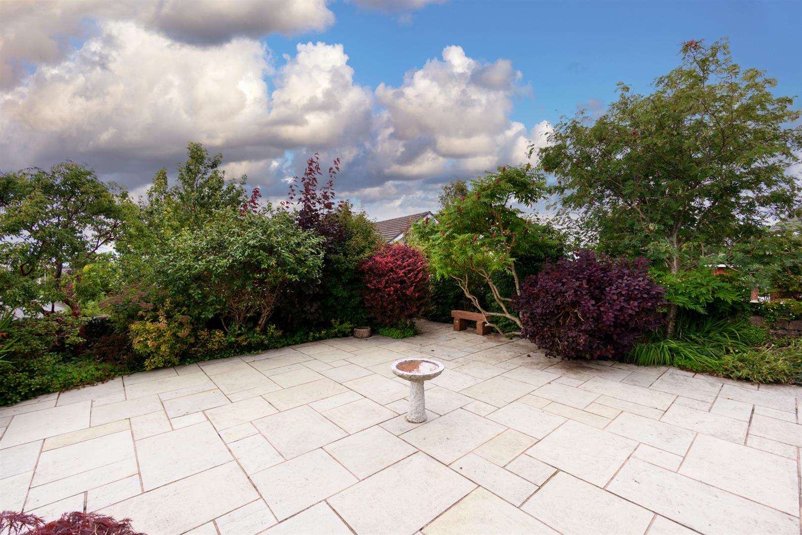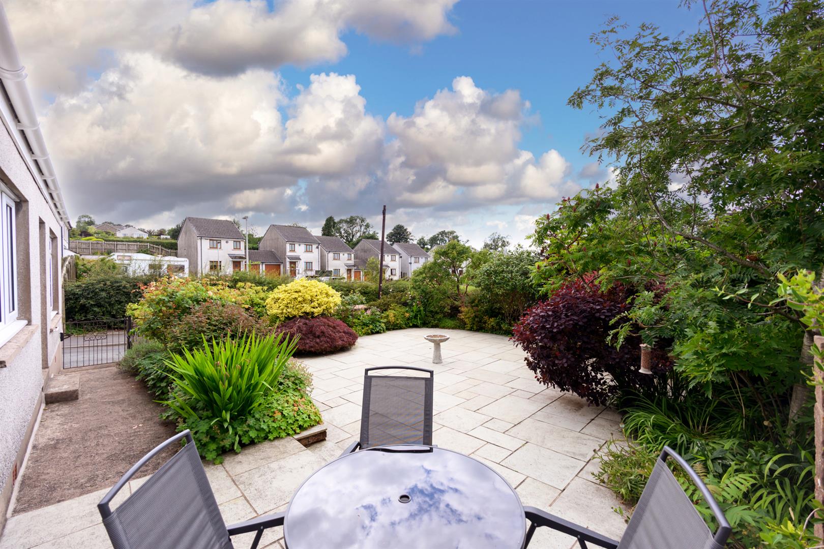 Accessed via a gate from the road, or from the lounge, with steps down leading to a large patio. Surrounded by beautifully maintained borders of shrubs and flowers, along with a lovely collection of trees.