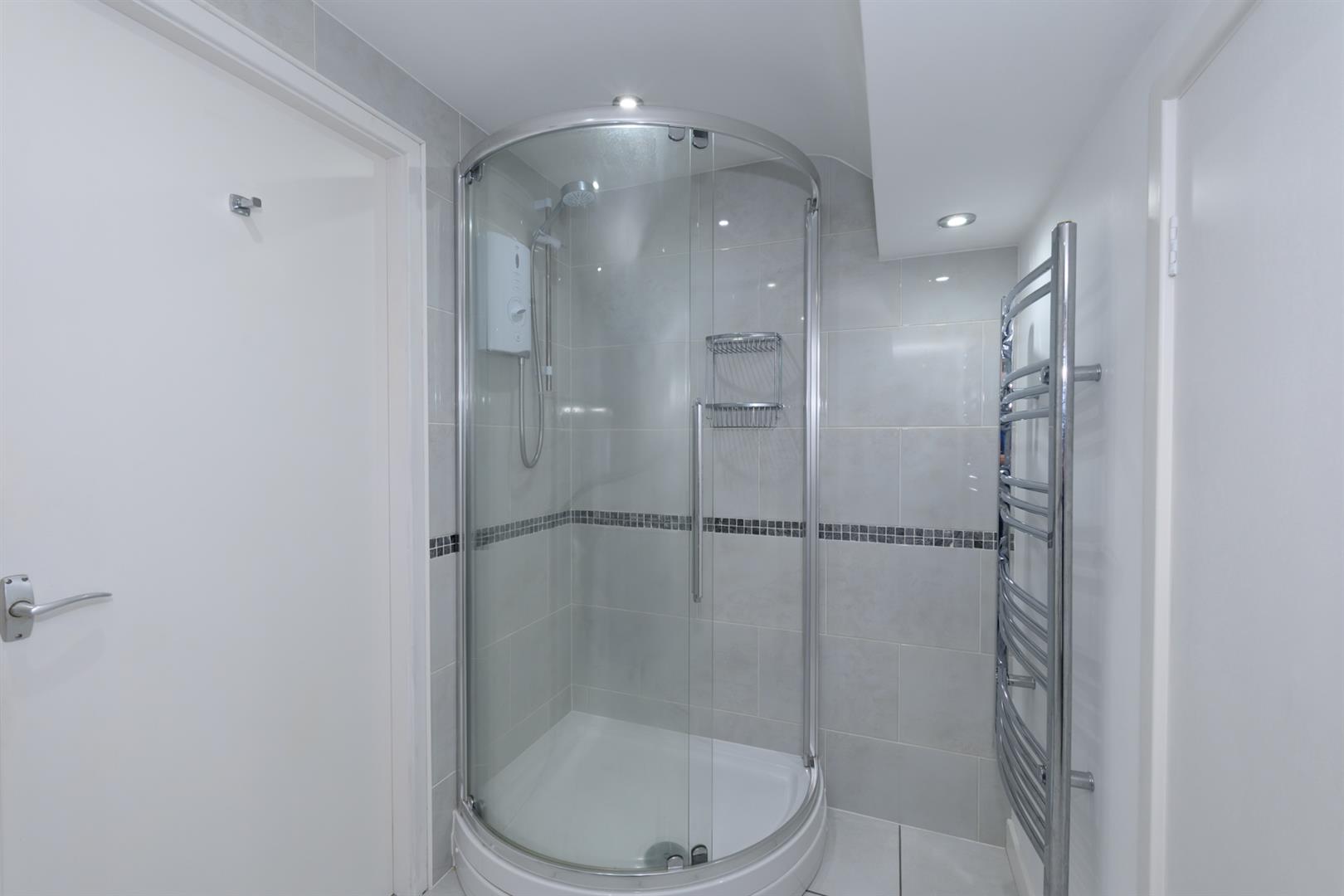 Fitted with shower enclosure, with curved screen and chrome frame, and wall mounted electric shower with attachments, wash basin with chrome mixer tap with vanity unit below and low-level WC. Pale grey tiled floor and ceramic tiles to the walls, wall mounted chrome bathroom fittings, extractor fan, spotlights and chrome ladder style electric radiator. Useful under eaves storage cupboard.