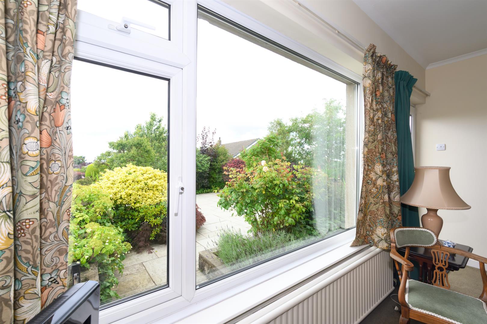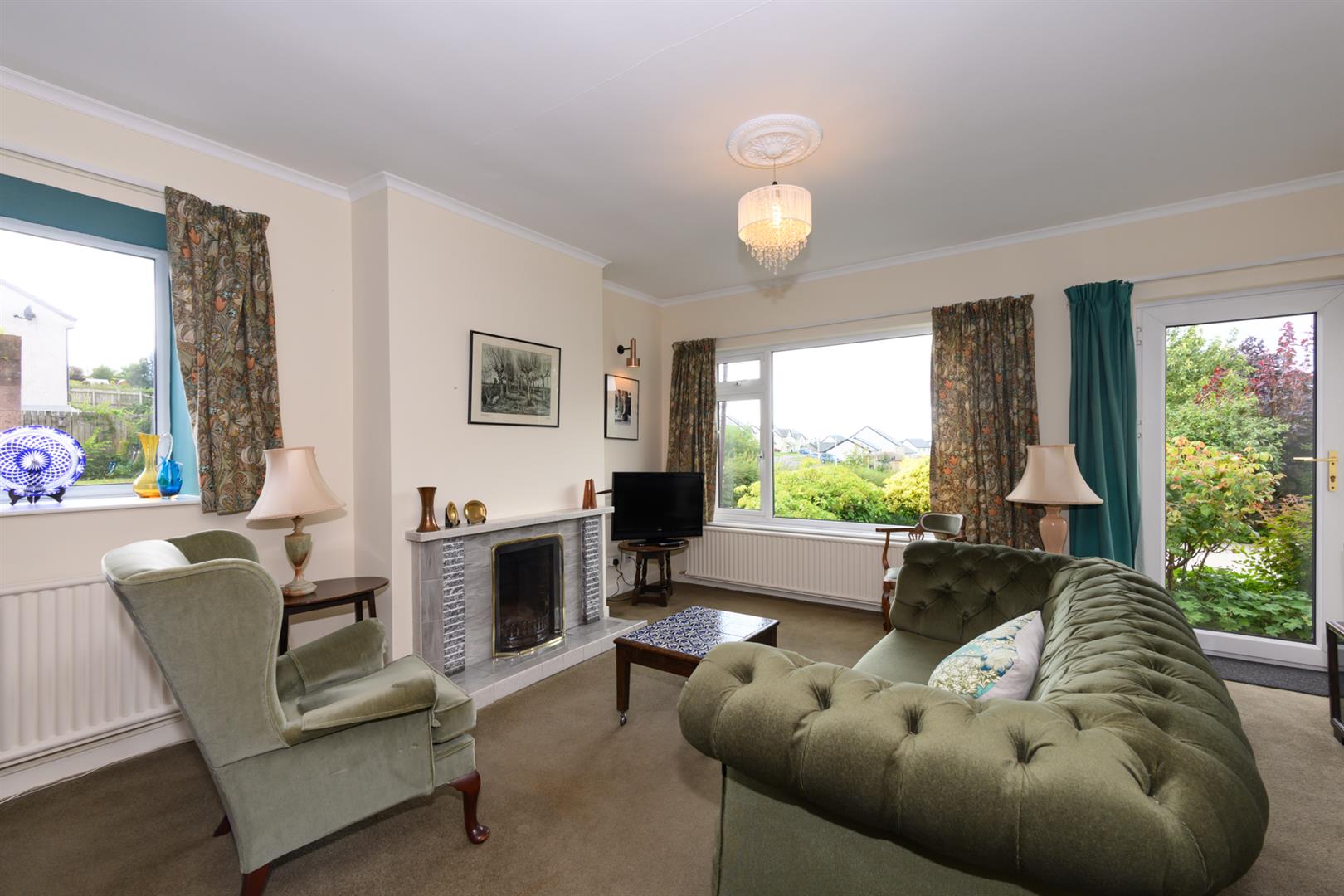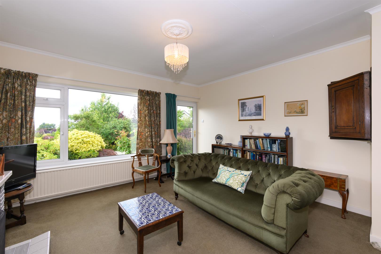 Large window overlooking the front with a delightful outlook over rooftops to countryside in the distance. Open fire on tiled hearth with matching surround. Coving, telephone and television points and patio door leading out to the garden.