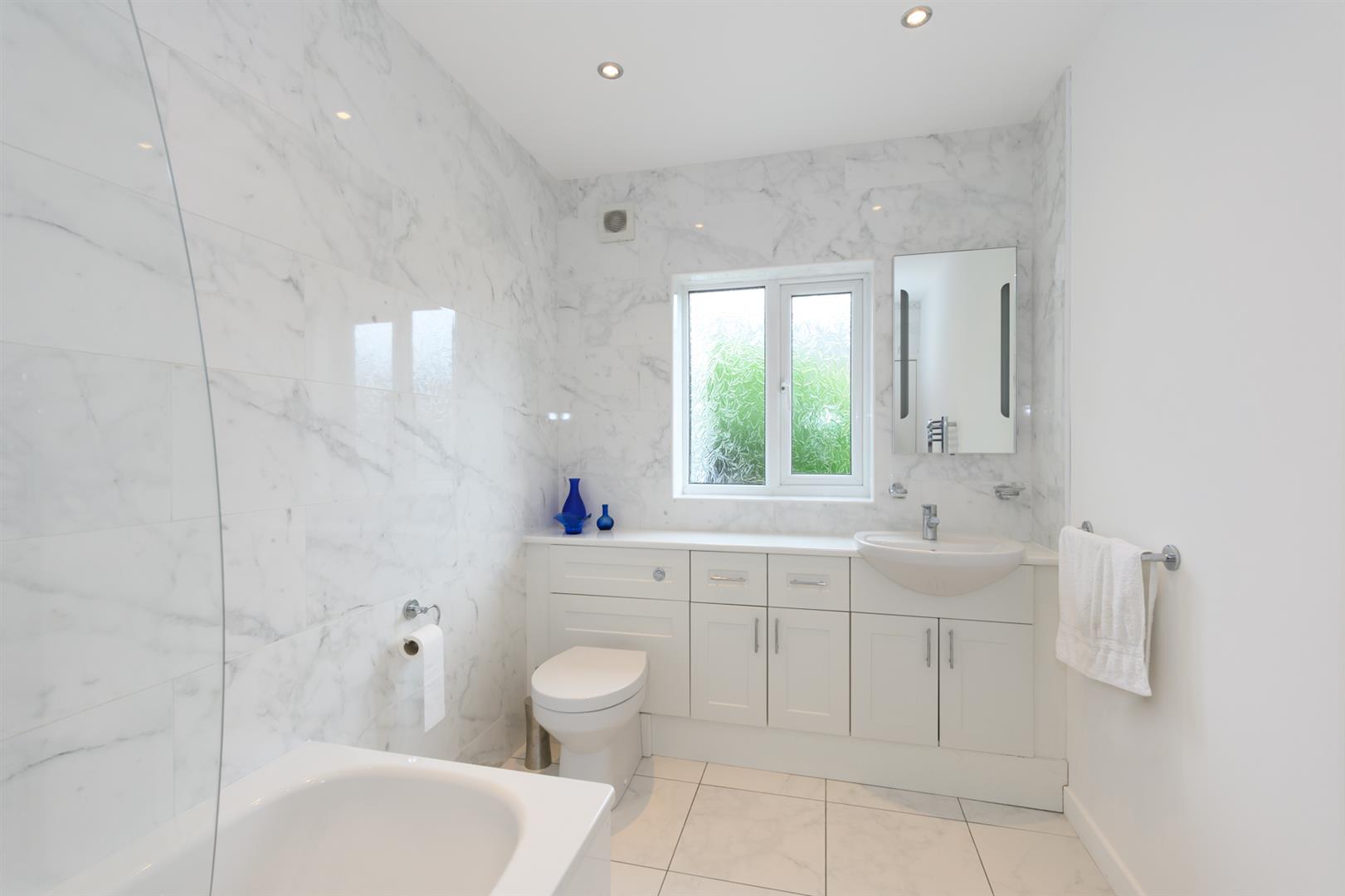 Fitted with bath, with chrome mixer tap over, and wall mounted chrome shower with attachments. Clear screen in chrome frame, low-level WC and wash basin set into white fronted vanity unit with chrome handles and white laminate work top over. Fitted mostly with grey marble effect tiling. Grey tiled floor, chrome ladder style radiator, shaver point and chrome bathroom fittings. Frosted window to the rear and extractor fan.