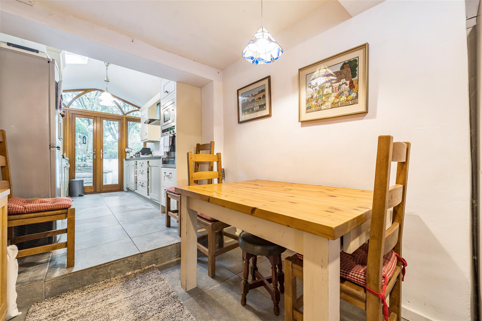 Useful understairs cupboard with attractive and discreet shelving to the side. Spotlighting. Ample space for dining table and grey tiled floor. Step up into the: