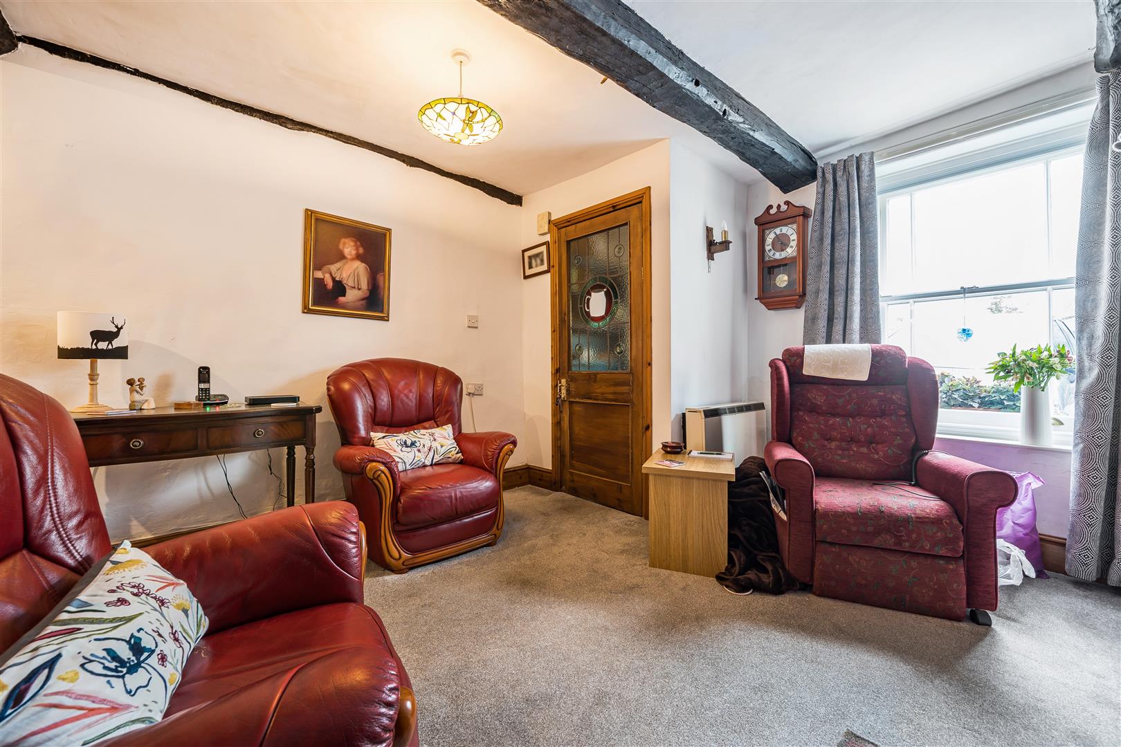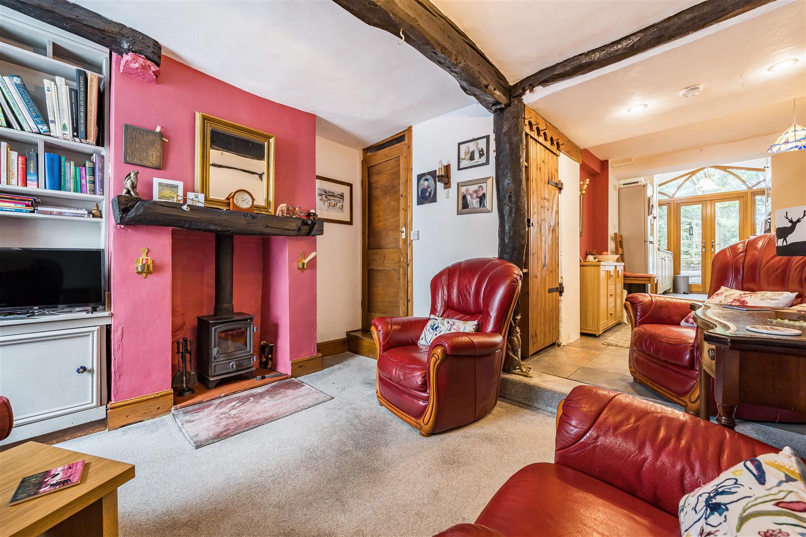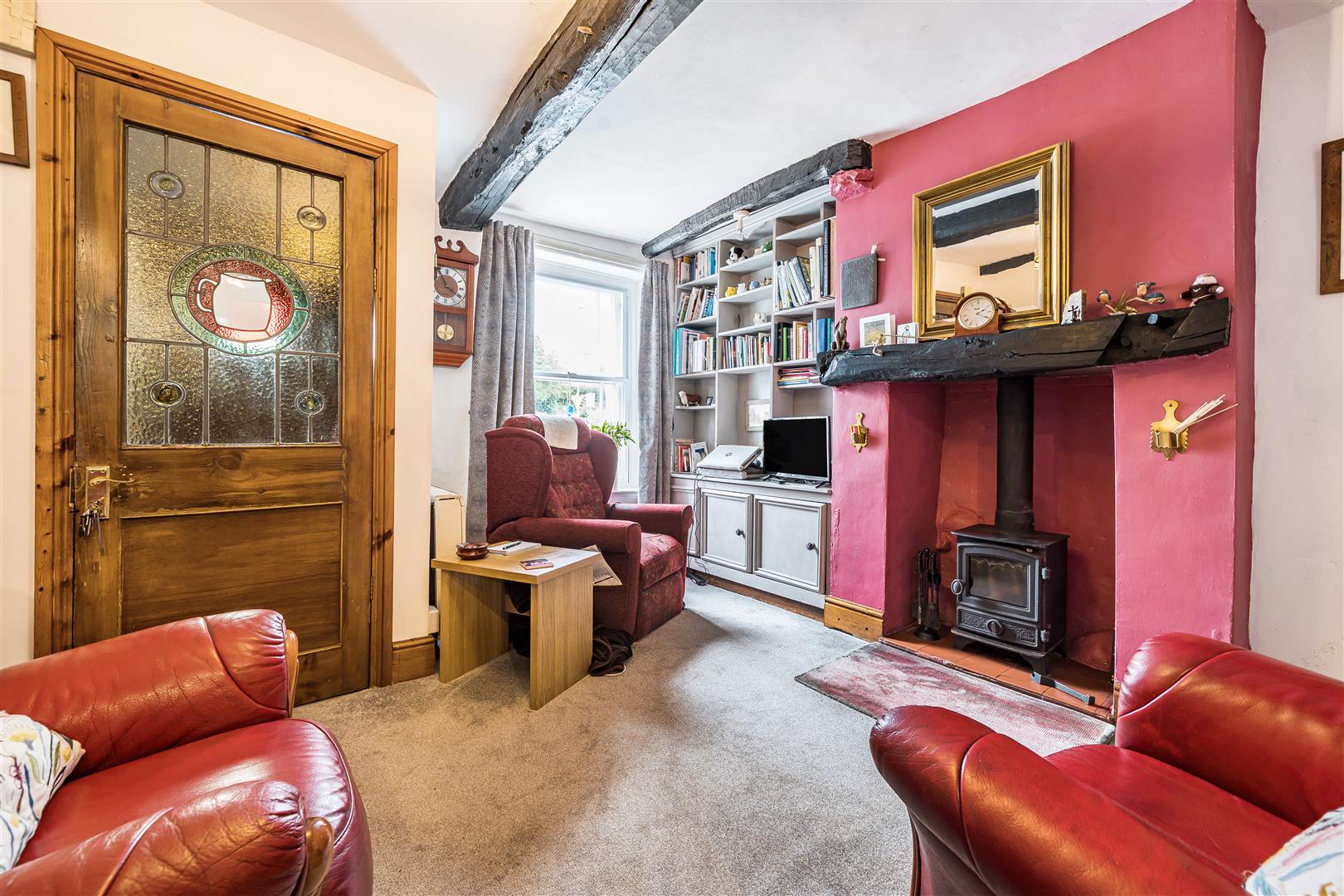 Wood burning stove in fireplace alcove with tiled hearth, dark stained timber beams, recessed shelving and window overlooking the front. Door leading to the first floor and step up into the dining area.