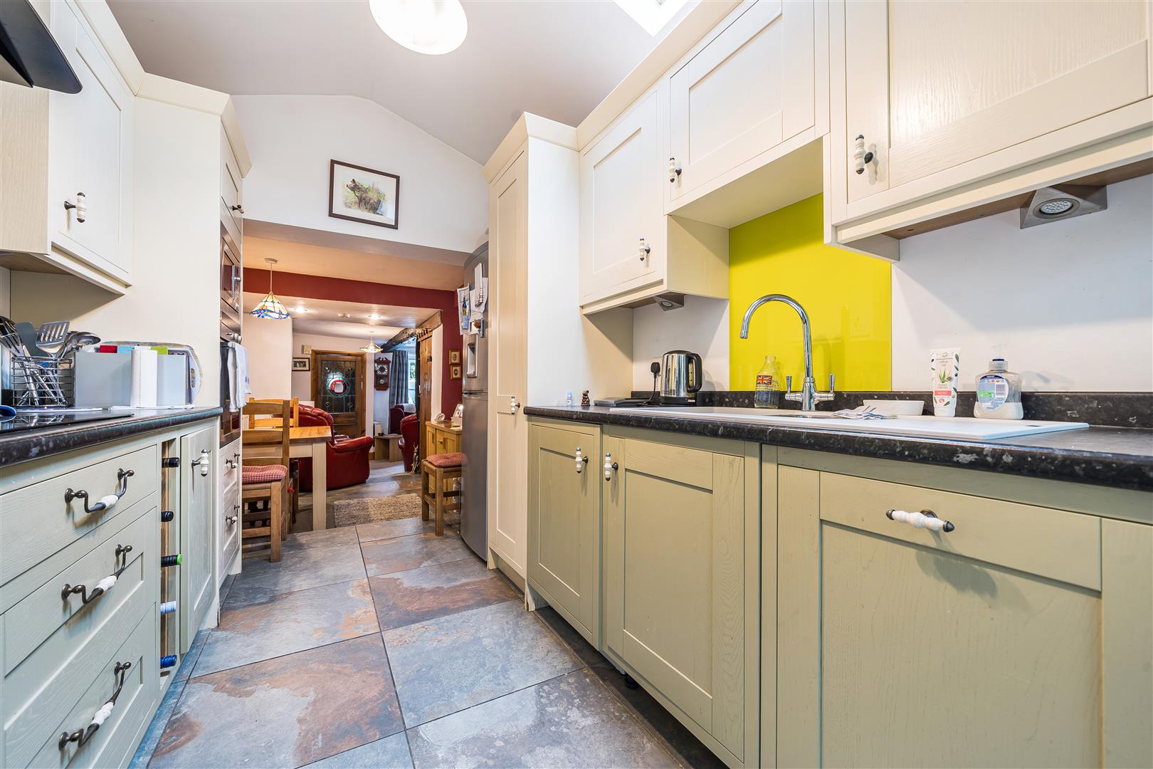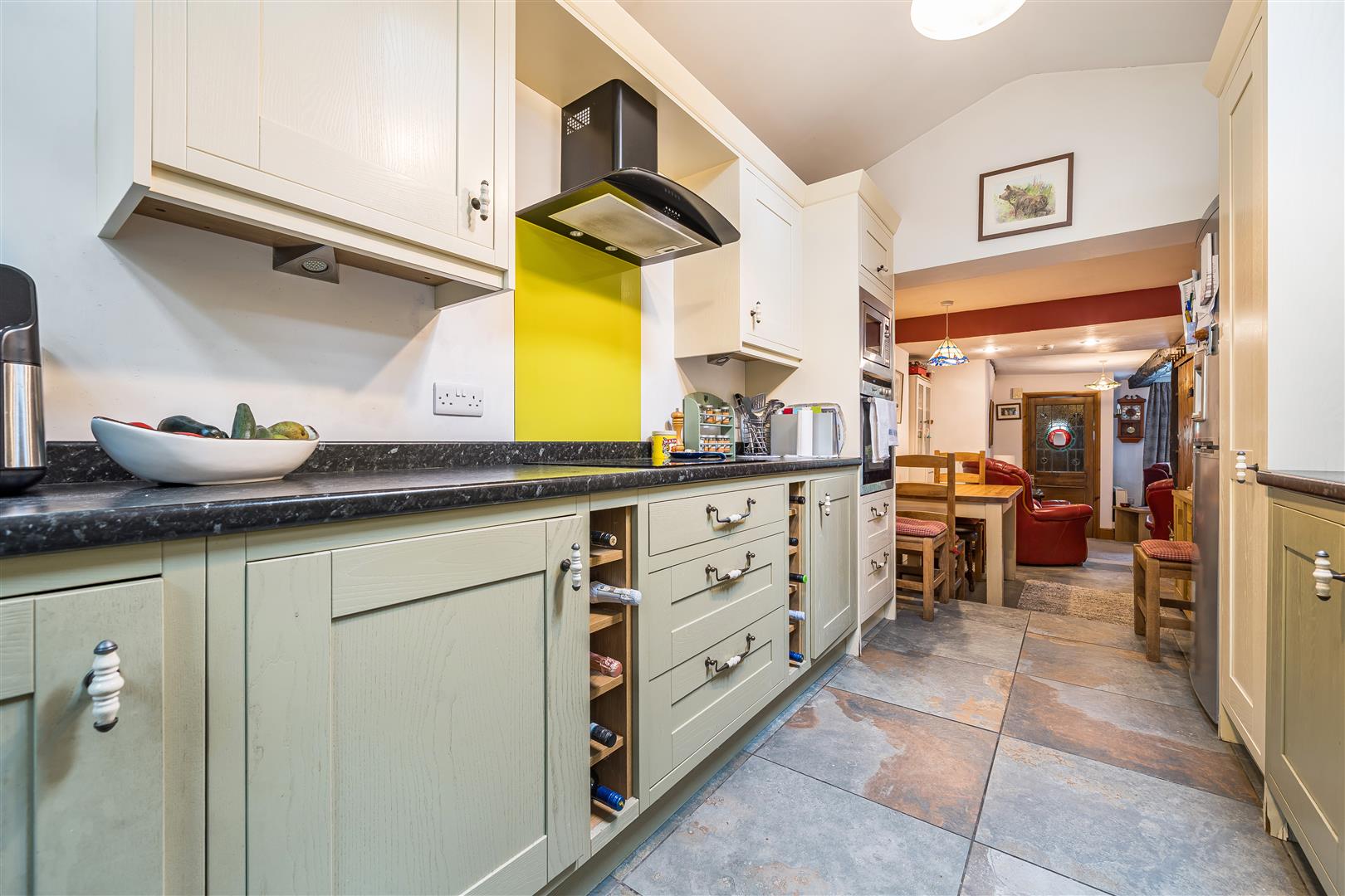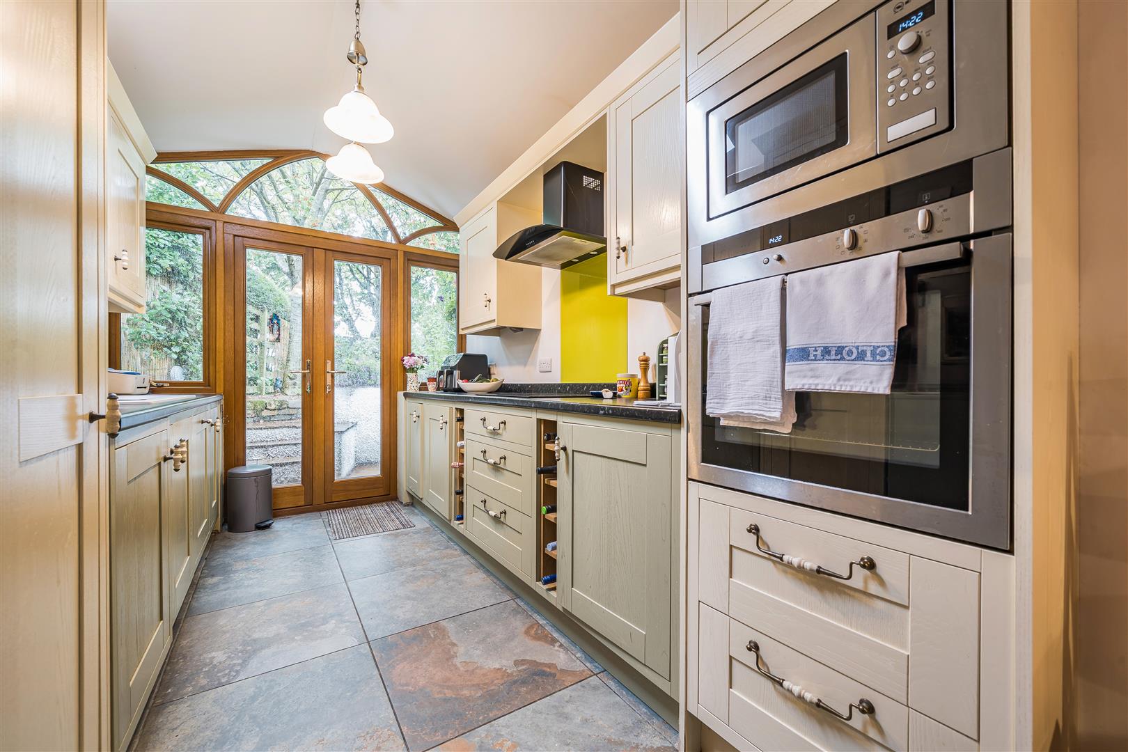 Fitted with a comprehensive range of base and wall units in a combination of green and cream paint work with attractive ceramic and metal handles and laminate worktop with matching upstand. Includes 1.5 bowl white composite sink unit with mixer tap and green splash-back. Integrated electric oven with microwave. 4 ring electric hob, green splash-back and extractor fan. Integrated dishwasher and concealed washing machine. Space for a fridge freezer. Tiled floor and double French doors with glazing either side and an attractive archway over leads out onto the garden.