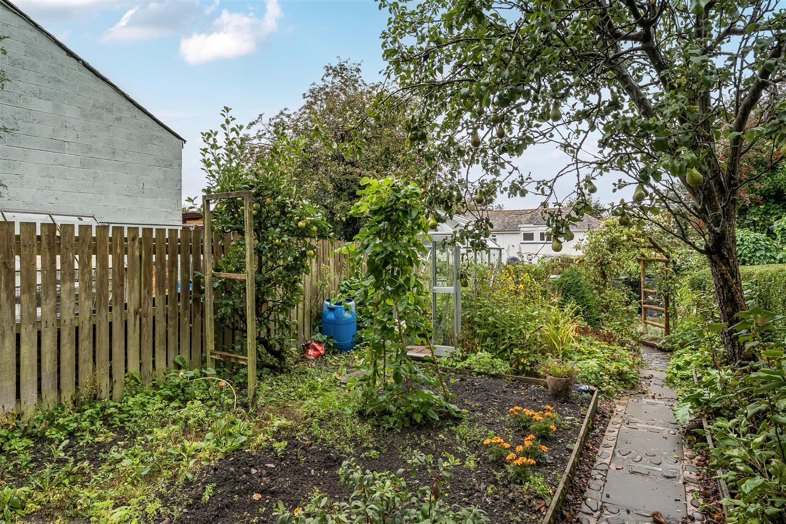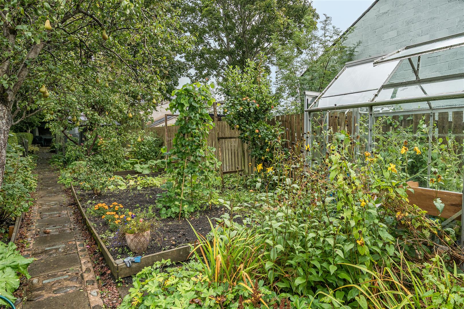 With raised borders providing an abundance of planting including shrubs and flowers as well as herbs, rhubarb and vegetables. Soft fruit bushes include raspberries, blackcurrants etc as well as a pear tree laden with fruit. An archway leads down to: