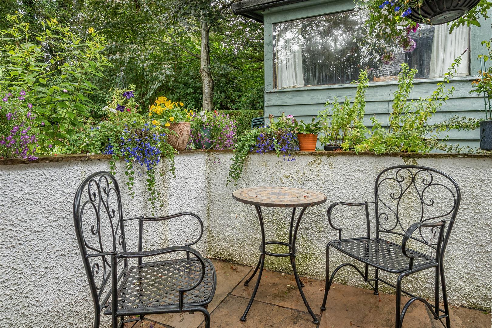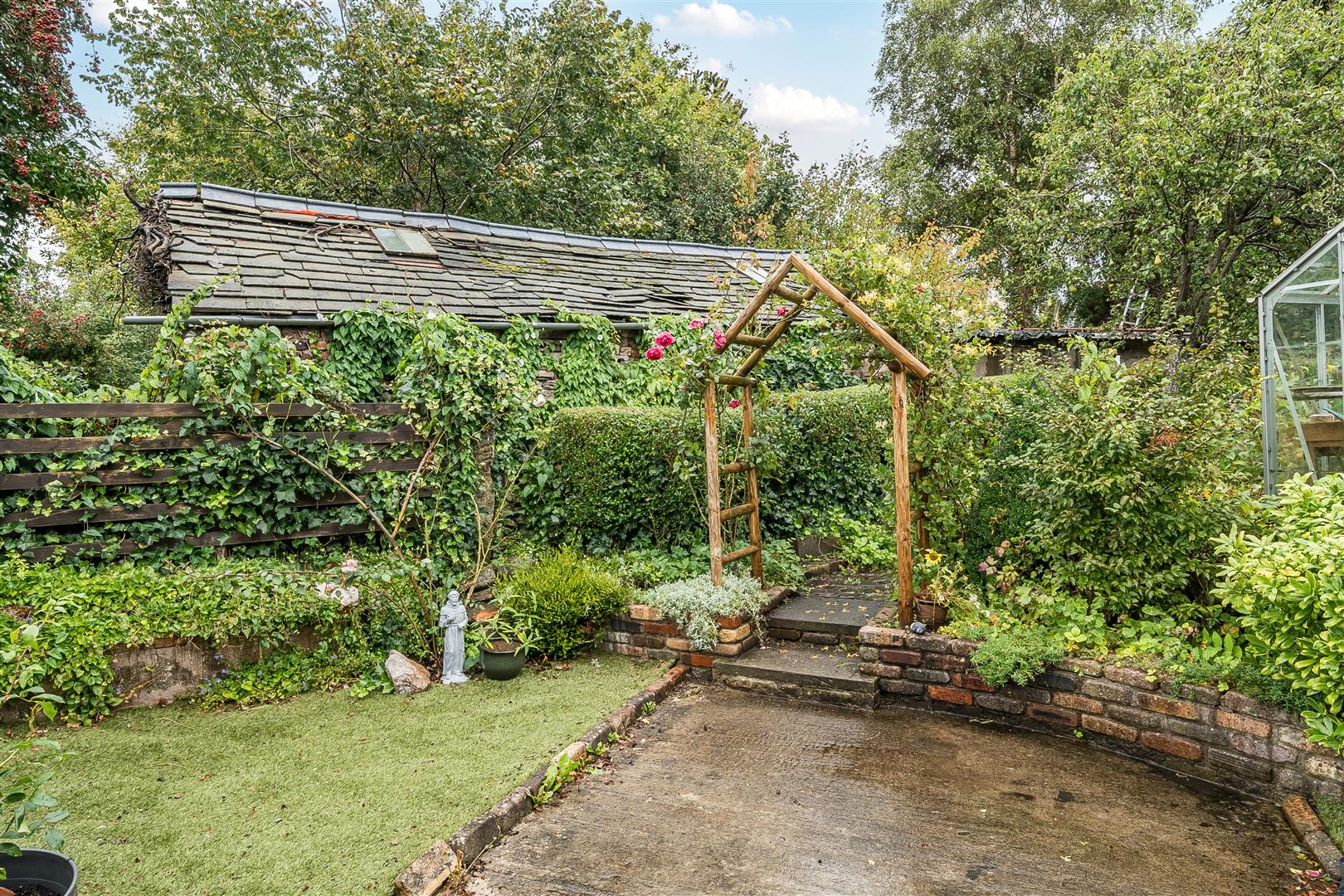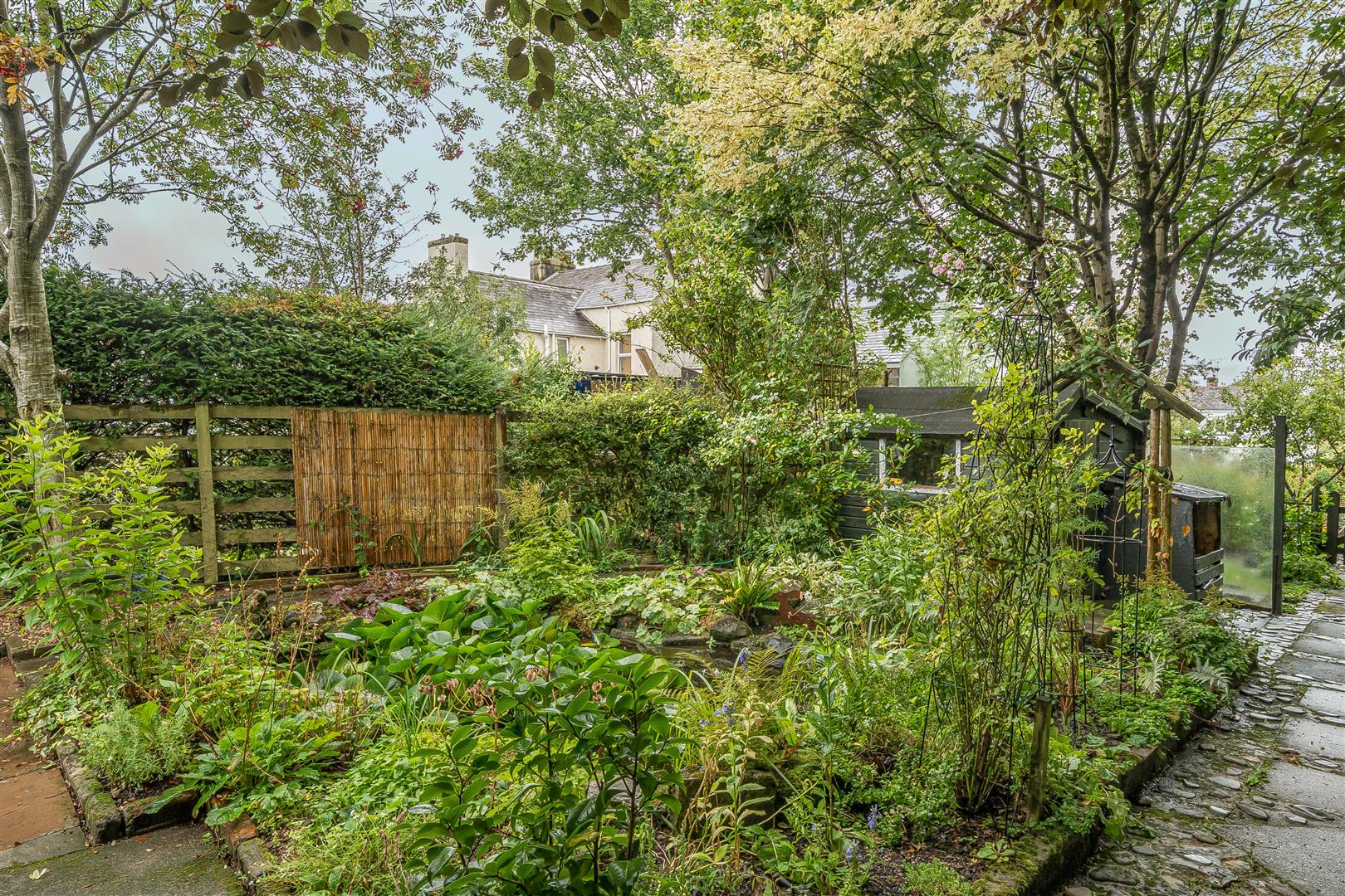 A path leads past a detached shed (with a large window overlooking the garden and with an attached log store) and a brick built bench overlooks a small lawn with a gate separating this garden from the next.