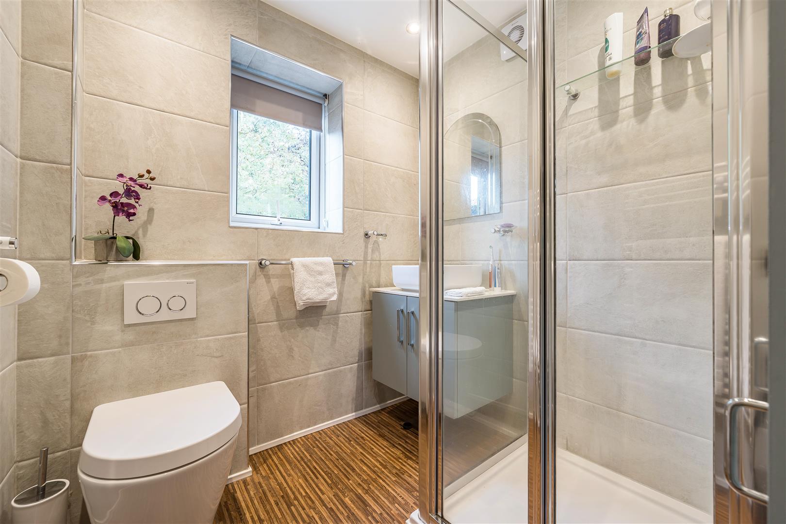 Shower enclosure with electric shower. Wash basin with mixer tap set onto a vanity unit with cupboards below and WC with concealed flush panel. Fully tiled throughout with ceramic tiling, white ladder style radiator. Extractor fan. Spotlighting. Chrome bathroom fittings and UPVC window to the rear.