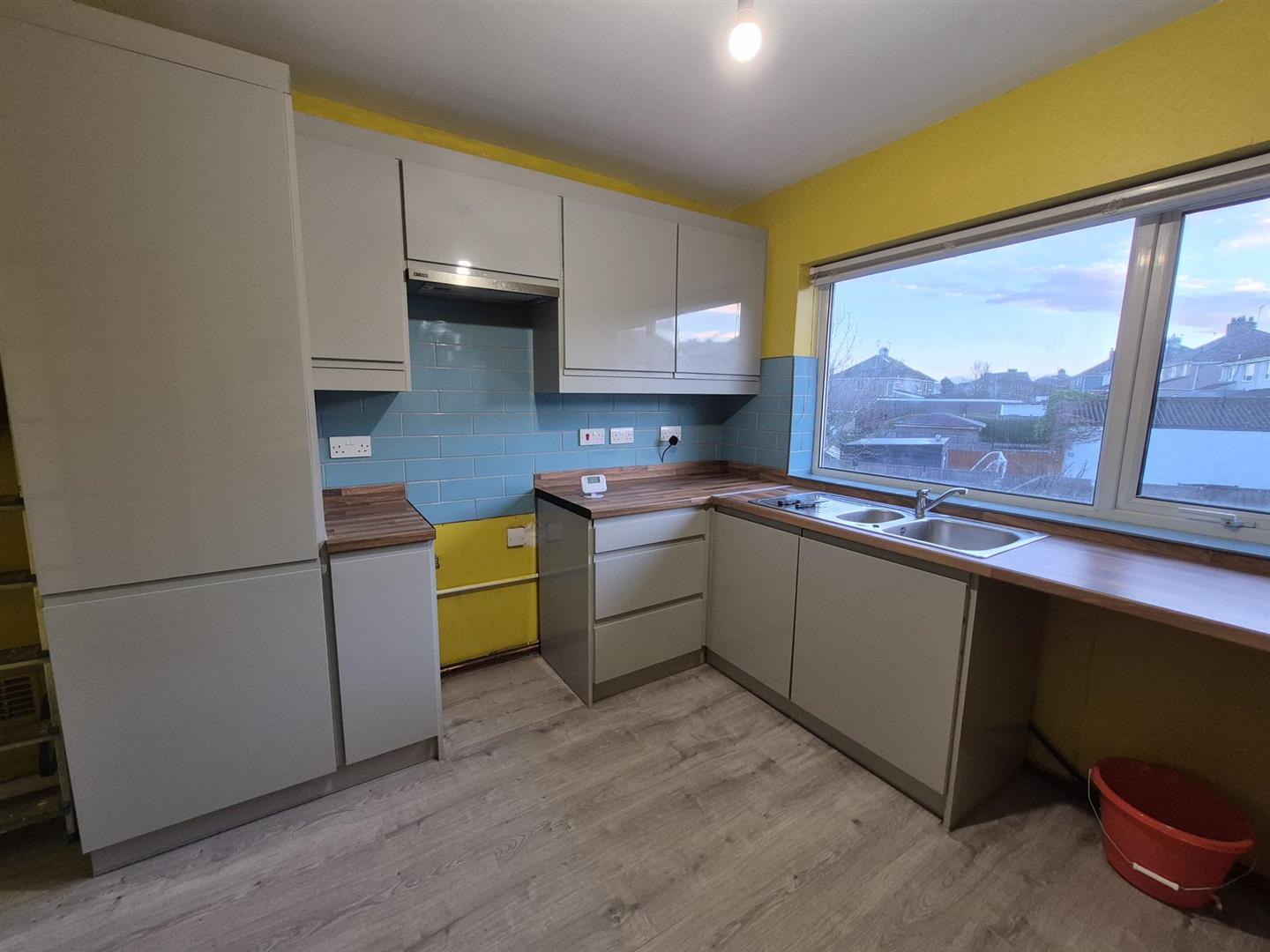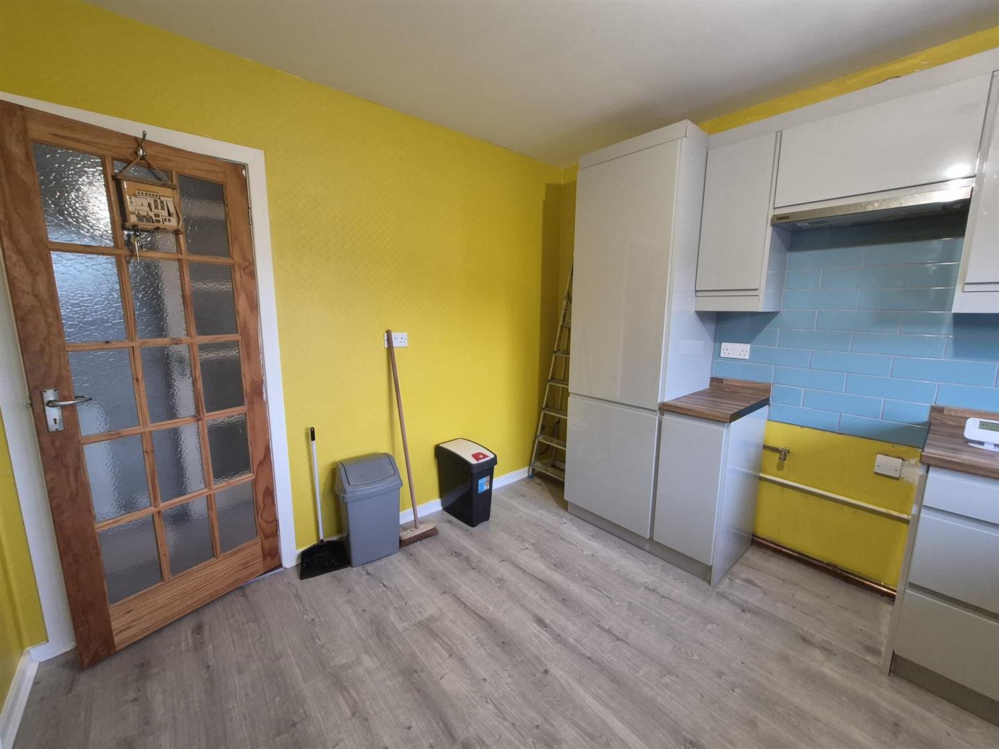 Fitted with a range of grey gloss wall and base units with complementary work surfaces. Inset sink and draining unit, plumbing for washing machine, extractor fan fitted, decorative blue wall tiling. Radiator. Rear aspect double glazed window.