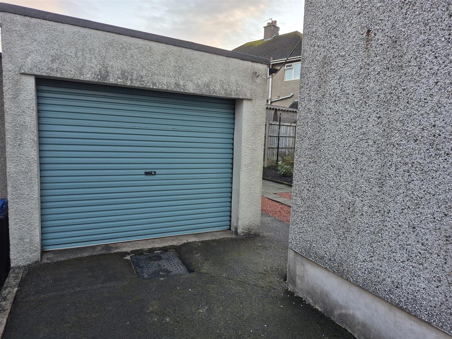 Up and over, manual front door accompanied by UPVC door to the side, side aspect window. Single in size.