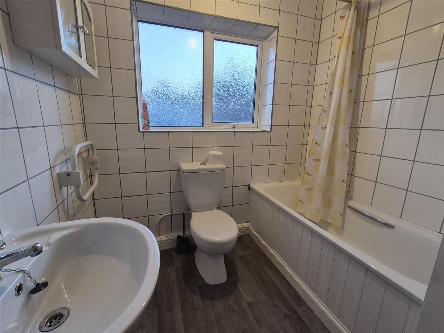 Three piece suite comprising of bath with overhead shower, WC and wash basin. Radiator, white wall tiling, rear aspect frosted double glazed window.