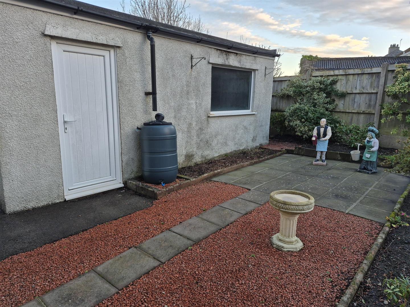 Driveway parking for two vehicles leading to low maintenance rear garden with decorative borders and patio seating area.